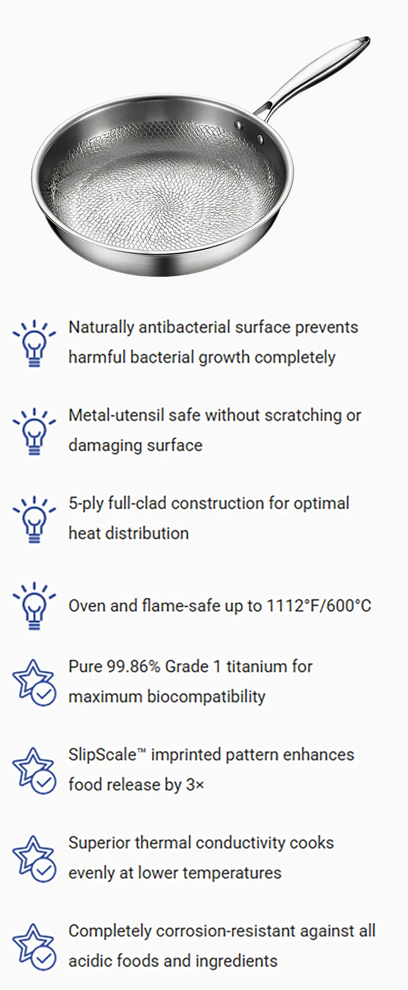 - Natural Non-Stick Titanium with Antibacterial Properties – Naturally antibacterial, free of heavy metals.